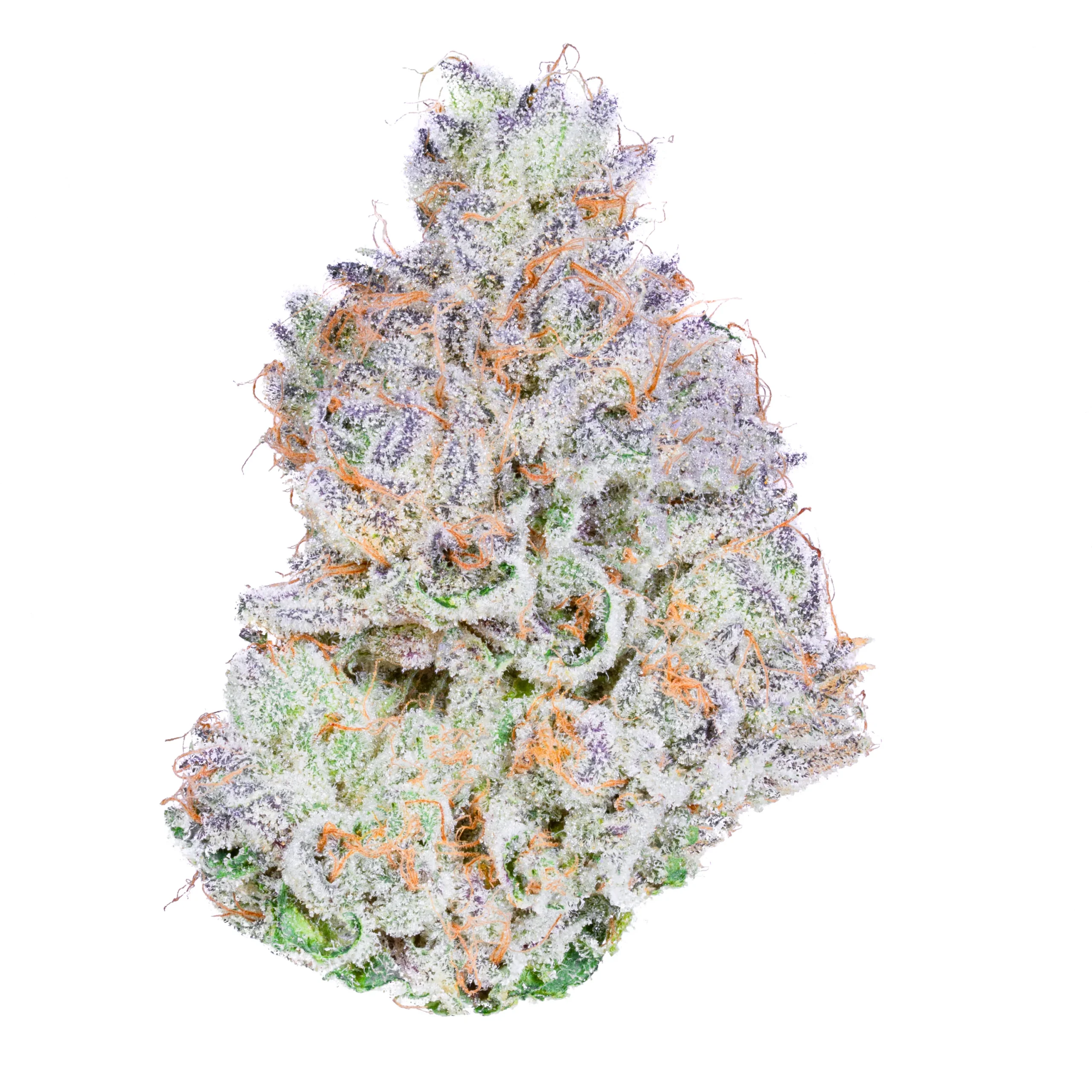 Die Blüte selbst schimmert im Sternenlicht, ihre Oberfläche ist mit kristallinen Trichomen überzogen, die ihr einen kühlen, metallisch-grauen Schimmer verleihen. Beim Aufschneiden schimmern darunter leuchtende Violett- und satte Grüntöne, als würden sie die Farben eines außerirdischen Dschungels verbergen.