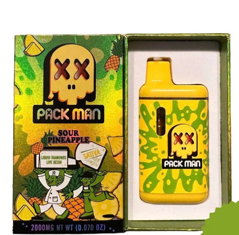 Der Packman Sour Pineapple 2g Disposable Vape ist ein gebrauchsfertiger THC-Vape-Pen, der mit ca. 2 Gramm Cannabis-Extrakt vorgefüllt ist und typischerweise hohe THC-Werte im Bereich von ca. 85 – 94 % THC bietet – für kräftige, langanhaltende Effekte bei jedem Zug.